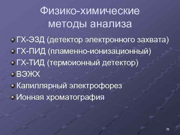 Физико-химические методы анализа ГХ-ЭЗД (детектор электронного захвата) ГХ-ПИД (пламенно-ионизационный) ГХ-ТИД (термоионный детектор) ВЭЖХ Капиллярный электрофорез Ионная хроматография 35