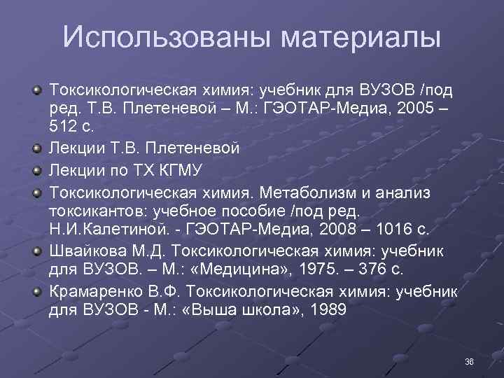 Использованы материалы Токсикологическая химия: учебник для ВУЗОВ /под ред. Т. В. Плетеневой – М. : ГЭОТАР-Медиа, 2005 – 512 с. Лекции Т. В. Плетеневой Лекции по ТХ КГМУ Токсикологическая химия. Метаболизм и анализ токсикантов: учебное пособие /под ред. Н. И. Калетиной. - ГЭОТАР-Медиа, 2008 – 1016 с. Швайкова М. Д. Токсикологическая химия: учебник для ВУЗОВ. – М. : «Медицина» , 1975. – 376 с. Крамаренко В. Ф. Токсикологическая химия: учебник для ВУЗОВ - М. : «Выша школа» , 1989 36
