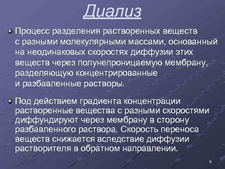 Диализ Процесс разделения растворенных веществ с разными молекулярными массами, основанный на неодинаковых скоростях диффузии этих веществ через полунепроницаемую мембрану, разделяющую концентрированные и разбавленные растворы. Под действием градиента концентрации растворенные вещества с разными скоростями диффундируют через мембрану в сторону разбавленного раствора. Скорость переноса веществ снижается вследствие диффузии растворителя в обратном направлении. 5
