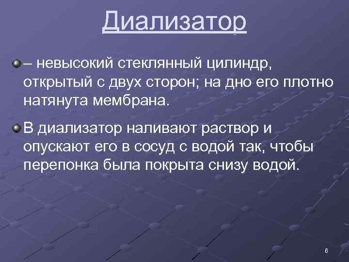 Диализатор – невысокий стеклянный цилиндр, открытый с двух сторон; на дно его плотно натянута мембрана. В диализатор наливают раствор и опускают его в сосуд с водой так, чтобы перепонка была покрыта снизу водой. 6