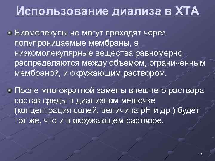Использование диализа в ХТА Биомолекулы не могут проходят через полупроницаемые мембраны, а низкомолекулярные вещества равномерно распределяются между объемом, ограниченным мембраной, и окружающим раствором. После многократной замены внешнего раствора состав среды в диализном мешочке (концентрация солей, величина p. H и др. ) будет тот же, что и в окружающем растворе. 7