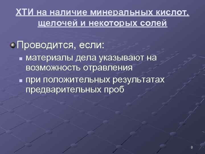 ХТИ на наличие минеральных кислот, щелочей и некоторых солей Проводится, если: n материалы дела указывают на возможность отравления n при положительных результатах предварительных проб 8
