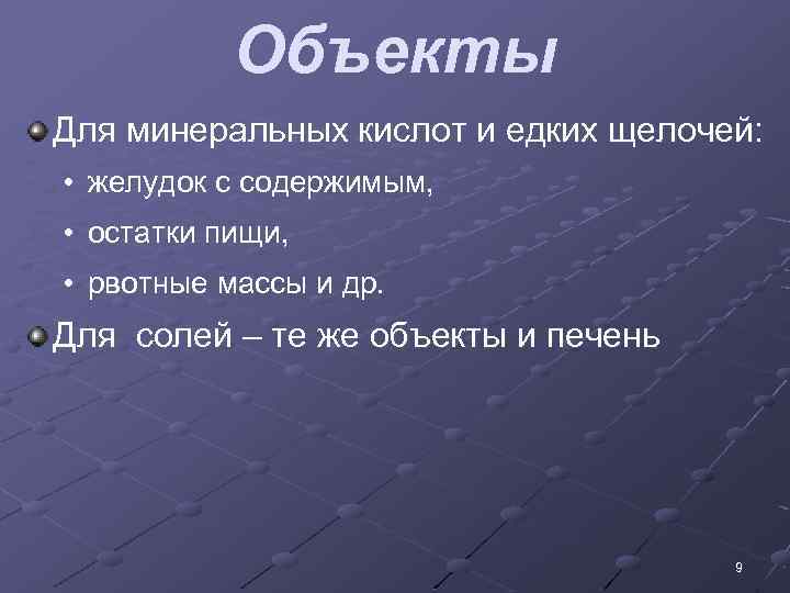 Объекты Для минеральных кислот и едких щелочей: • желудок с содержимым, • остатки пищи, • рвотные массы и др. Для солей – те же объекты и печень 9