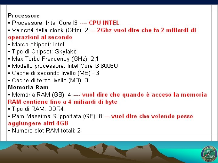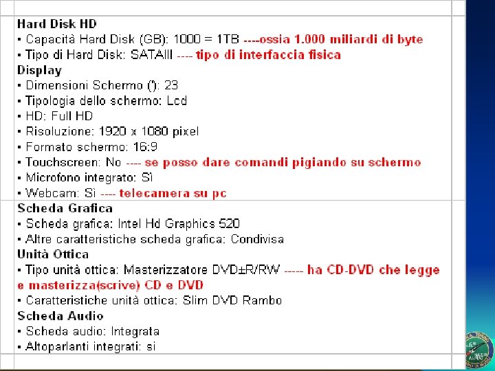 Vado a comprare un pc tel tablet che caratteristiche principali devo guardare? Esempio: LENOVO F 0 BY 00 KRIX IDEACENTRE AIO 300 -23 ISU Codice: 733986 • Processore Intel® Core™ i 3 -6006 U(2 GHz - 3 MB L 3) • HD 1000 GB (1 TB) 7200 RPM 3. 5 SATA 3 - RAM 4 GB - Wi. Fi 802. 11 a/b/g/n/ac • Bluetooth 4. 0 - Slim DVD Rambo - Windows 10 Home • Scheda grafica HD Graphics 520(Condivisa) • Display 23" LED Full HD 23" Led Risoluzione: 1920 x 1080 pixels Touchscreen: No