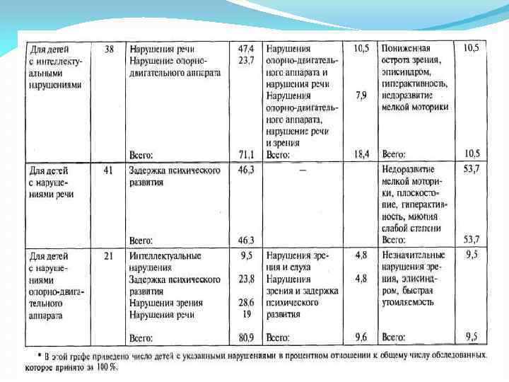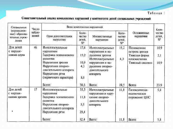 Отмечаются следующие тенденции в усложнении структуры дефекта: у большей части воспитанников с сенсорными нарушениями фиксируются также дополнительные интеллектуальные нарушения (17, 4 и 35, 3 %); для детей с интеллектуальными нарушениями в основном характерны речевые расстройства (47, 4%) и нарушения опорнодвигательной системы (23, 7 %); при речевых нарушениях чаще всего встречаются задержки психического развития (46, 3 %) и осложненные дефекты (53, 7 %); в структуре нарушения детей с ДЦП отмечаются весьма различные расстройства. Комплексные нарушения могут иметь дополнительные не ярко выраженные отклонения, которые осложняют структуру самого комплексного нарушения. Однако в силу большой вариативности сочетаний дефектов каждый случай требует индивидуального описания, что сопряжено с определенными трудностями.