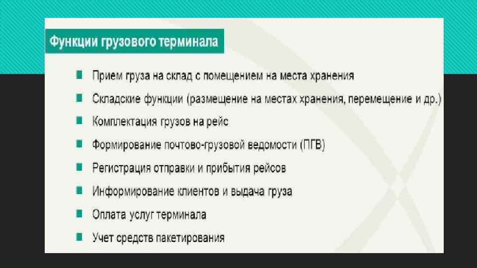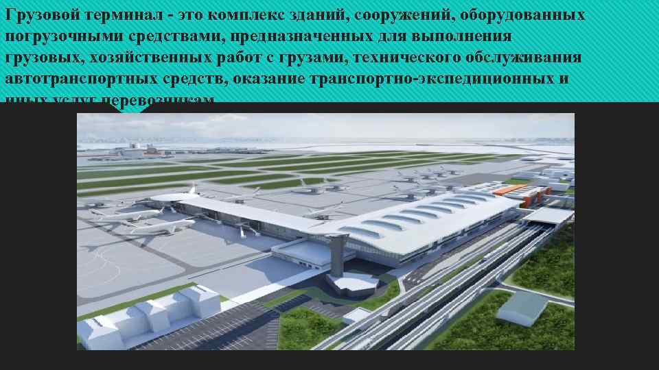 Грузовой терминал - это комплекс зданий, сооружений, оборудованных погрузочными средствами, предназначенных для выполнения грузовых, хозяйственных работ с грузами, технического обслуживания автотранспортных средств, оказание транспортно-экспедиционных и иных услуг перевозчикам