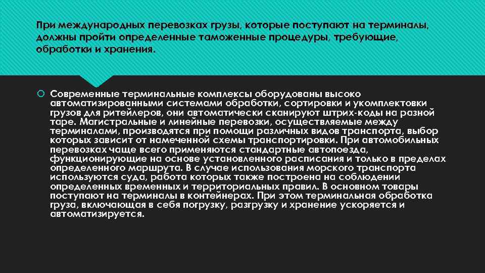 При международных перевозках грузы, которые поступают на терминалы, должны пройти определенные таможенные процедуры, требующие, обработки и хранения. Современные терминальные комплексы оборудованы высоко автоматизированными системами обработки, сортировки и укомплектовки грузов для ритейлеров, они автоматически сканируют штрих-коды на разной таре. Магистральные и линейные перевозки, осуществляемые между терминалами, производятся при помощи различных видов транспорта, выбор которых зависит от намеченной схемы транспортировки. При автомобильных перевозках чаще всего применяются стандартные автопоезда, функционирующие на основе установленного расписания и только в пределах определенного маршрута. В случае использования морского транспорта используются суда, работа которых также построена на соблюдении определенных временных и территориальных правил. В основном товары поступают на терминалы в контейнерах. При этом терминальная обработка груза, включающая в себя погрузку, разгрузку и хранение ускоряется и автоматизируется.