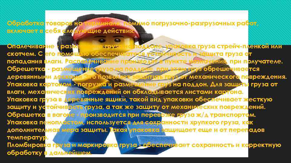 Обработка товаров на терминале, помимо погрузочно-разгрузочных работ, включает в себя следующие действия: Опалечивание - размещение груза на поддоне, упаковка груза стрейч-пленкой или скотчем. С его помощью обеспечиватеся устойчивость и защита груза от попадания влаги. Распалечивание производят в пункте назначения, при получателе. Обрешетка - размещение груза на поддоне, при этом груз обрешечивается деревянными досками Это позволяет защитить груз от механического повреждения. Упаковка картоном - погрузка и размещение груз на поддон. Для защиты груза от влаги, механических повреждений он обкладывается листами картона. Упаковка груза в деревянные ящики, такой вид упаковки обеспечивает жесткую защиту и устойчивость груза, а так же защиту от механических повреждений. Обрешетка в вагоне - производится при перевозке груза ж/д транспортом. Упаковка пенопластом, используется для сохранности хрупкого груза, как дополнительная мера защиты. Такая упаковка защищает еще и от перепадов температур. Пломбировка груза и маркировка груза - обеспечивает сохранность и корректную обработку в дальнейшем.