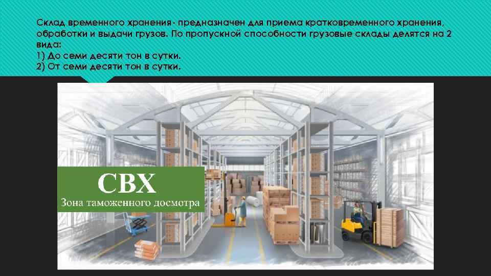 Склад временного хранения- предназначен для приема кратковременного хранения, обработки и выдачи грузов. По пропускной способности грузовые склады делятся на 2 вида: 1) До семи десяти тон в сутки. 2) От семи десяти тон в сутки.