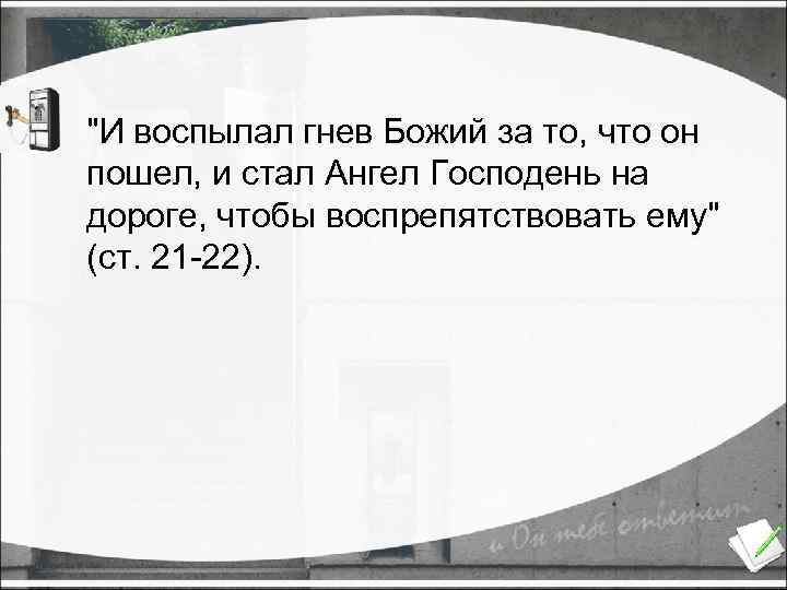 "И воспылал гнев Божий за то, что он пошел, и стал Ангел Господень на дороге, чтобы воспрепятствовать ему" (ст. 21 -22).