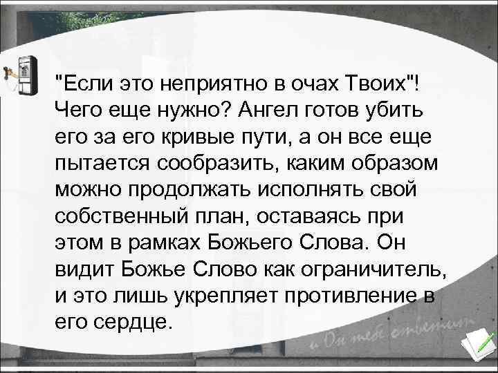 "Если это неприятно в очах Твоих"! Чего еще нужно? Ангел готов убить его за его кривые пути, а он все еще пытается сообразить, каким образом можно продолжать исполнять свой собственный план, оставаясь при этом в рамках Божьего Слова. Он видит Божье Слово как ограничитель, и это лишь укрепляет противление в его сердце.