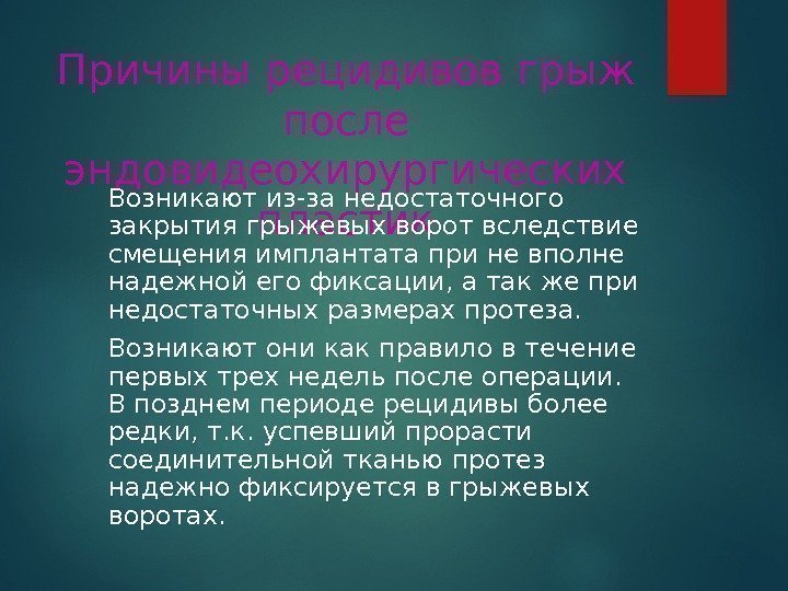 Причины рецидивов грыж после эндовидеохирургических пластик. Возникают из-за недостаточного закрытия грыжевых ворот вследствие смещения имплантата при не вполне надежной его фиксации, а так же при недостаточных размерах протеза. Возникают они как правило в течение первых трех недель после операции. В позднем периоде рецидивы более редки, т. к. успевший прорасти соединительной тканью протез надежно фиксируется в грыжевых воротах.
