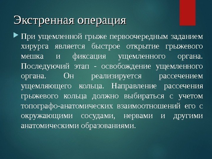 Экстренная операция При ущемленной грыже первоочередным заданием хирурга является быстрое открытие грыжевого мешка и фиксация ущемленного органа. Последуючий этап — освобождение ущемленного органа. Он реализируется рассечением ущемляющего кольца. Направление рассечения грыжевого кольца должно выбираться с учетом топографо-анатомических взаимоотношений его с окружающими сосудами, нервами и другими анатомическими образованиями.