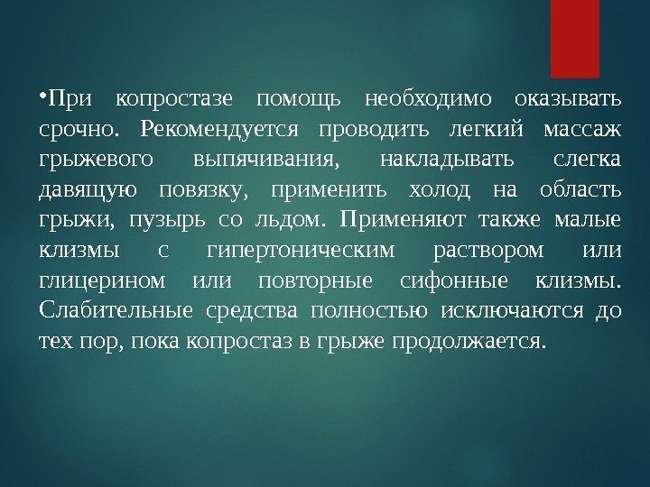 • При копростазе помощь необходимо оказывать срочно. Рекомендуется проводить легкий массаж грыжевого выпячивания, накладывать слегка давящую повязку , применить холод на область грыжи, пузырь с о льдом. Применяют также малые клизмы с гипертоническим раствором или глицерином или повторные сифон н ые клизмы. Слабительные средства полностью исключаются до тех пор, пока копростаз в грыже продолжается.