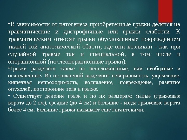 • В зависимости от патогенеза приобретенные грыжи делятся на травматические и дистрофичные или грыжи слабости. К травматическим относят грыжи обусловленные повреждением тканей то й анатомическо й обасти , где они возникли — как при случайной травме так и специальной , в том числе и операционной (послеоперационные грыжи). • Грыжи разделяют также на неосложненные, или свободные и осложненные. Из осложнений выделяют невправимость , ущемление, кишечная непроходимость, воспаление, повреждение, развитие опухолей, посторонние тела в грыже. • Существует деление грыж и по их размерам: малые (грыжевые ворота до 2 см), средние (до 4 см) и большие — когда грыжевые ворота более 4 см. Большие грыжи называют еще гигантскими.