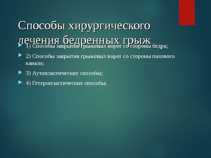Способы хирургического лечения бедренных грыж 1) Способы закрытия грыжевых ворот со стороны бедра; 2) Способы закрытия грыжевых ворот со стороны пахового канала; 3) Аутопластические способы; 4) Гетеропластические способы.