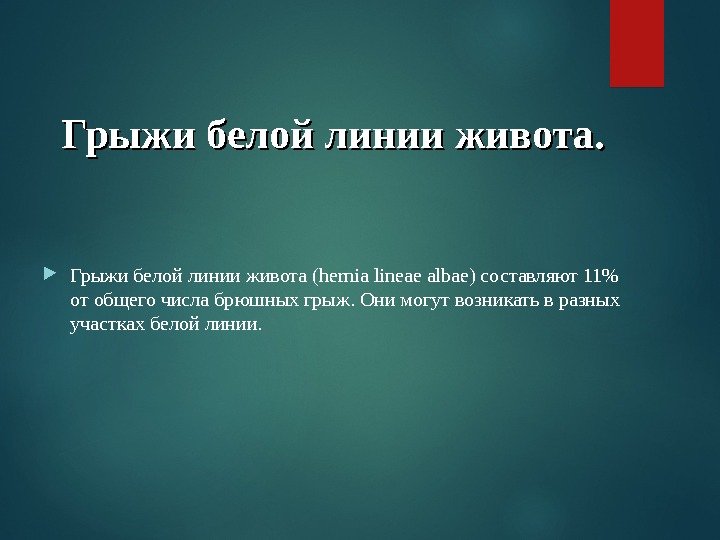 Грыжи белой линии живота. Грыжи белой линии живота (hernia lineae albae) составляют 11% от общего числа брюшных грыж. Они могут возникать в разных участках белой линии.