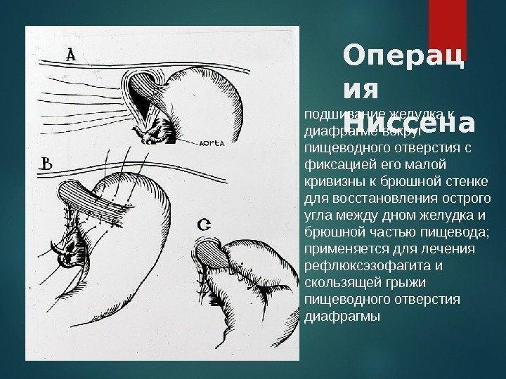 Операц ия Ниссенаподшивание желудка к диафрагме вокруг пищеводного отверстия с фиксацией его малой кривизны к брюшной стенке для восстановления острого угла между дном желудка и брюшной частью пищевода; применяется для лечения рефлюксэзофагита и скользящей грыжи пищеводного отверстия диафрагмы