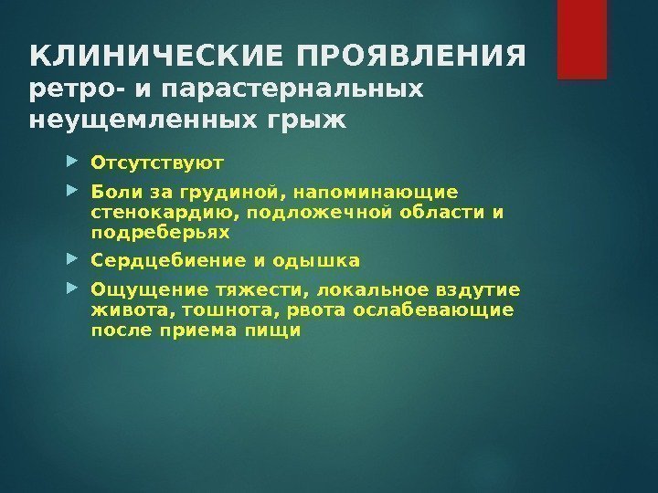 КЛИНИЧЕСКИЕ ПРОЯВЛЕНИЯ ретро- и парастернальных неущемленных грыж Отсутствуют Боли за грудиной, напоминающие стенокардию, подложечной области и подреберьях Сердцебиение и одышка Ощущение тяжести, локальное вздутие живота, тошнота, рвота ослабевающие после приема пищи