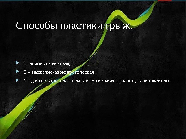 Способы пластики грыж. . 1 — апоневротическая ; 2 – мышечно-апоневротическая; 3 — другие виды пластики (лоскутом кожи, фасции, аллопластика ).