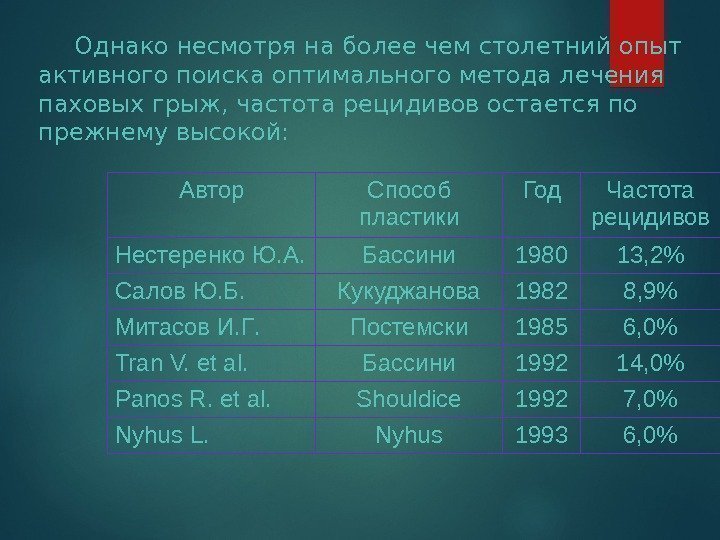 Однако несмотря на более чем столетний опыт активного поиска оптимального метода лечения паховых грыж, частота рецидивов остается по прежнему высокой: Автор Способ пластики Год Частота рецидивов Нестеренко Ю. А. Бассини 1980 13 , 2 % Салов Ю. Б. Кукуджанова 1982 8, 9% Митасов И. Г. Постемски 1985 6, 0% Tran V. et al. Бассини 1992 1 4, 0% Panos R. et al. Shouldice 1992 7, 0% Nyhus L. Nyhus 1993 6, 0%