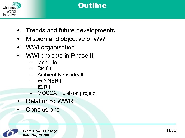 Outline Trends and future developments Mission and objective of WWI organisation WWI projects in Phase II – – – Mobi. Life SPICE Ambient Networks II WINNER II E 2 R II MOCCA – Liaison project Relation to WWRF Conclusions Event: GSC-11 Chicago Date: May 29, 2006 Slide 2