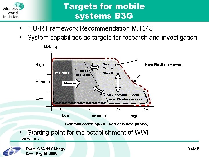 Targets for mobile systems B 3 G • ITU-R Framework Recommendation M. 1645 • System capabilities as targets for research and investigation Mobility High IMT-2000 Medium Enhanced IMT-2000 New Radio Interface New Mobile Access Enhancement New Nomadic / Local Area Wireless Access Low 1 10 Low 100 Medium 1000 High Communication speed / Carrier bitrate (Mbit/s) • Starting point for the establishment of WWI Source: ITU-R Event: GSC-11 Chicago Date: May 29, 2006 Slide 6