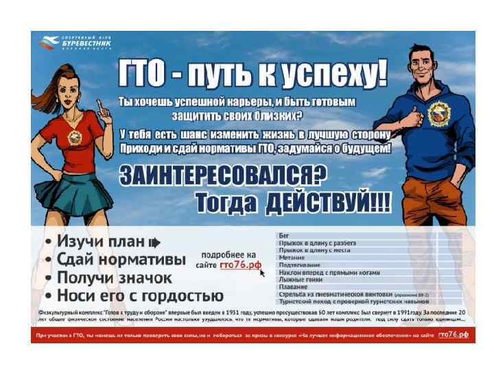 Проведение отрядом мероприятия «ГТО - наш выбор» • Мероприятие проводится в образовательной организации / приспособленном для проведения спортивного мероприятия месте с использованием различных творческих средств популяризации «ГТО» . Обязателен процесс сдачи нормативов (задача – дать попробовать свои силы сверстникам, на практике) 20 февраля в 16: 30 в спортивном зале