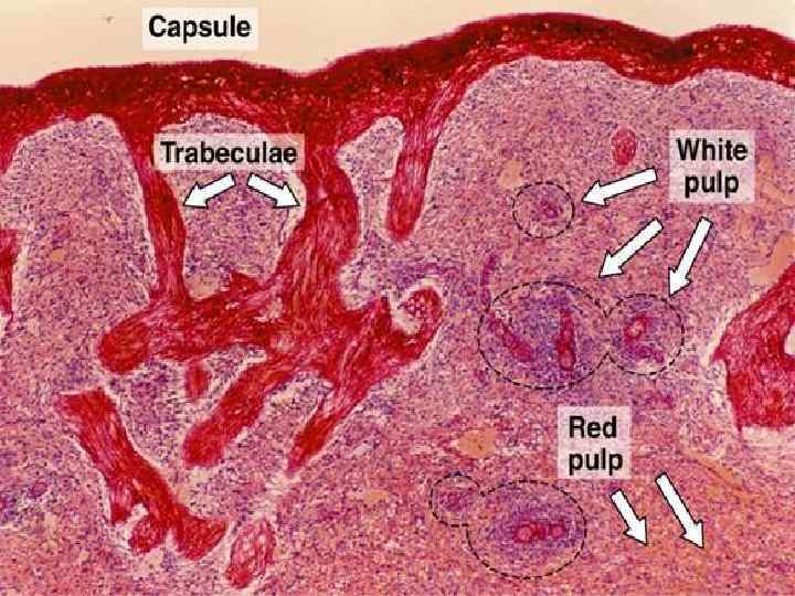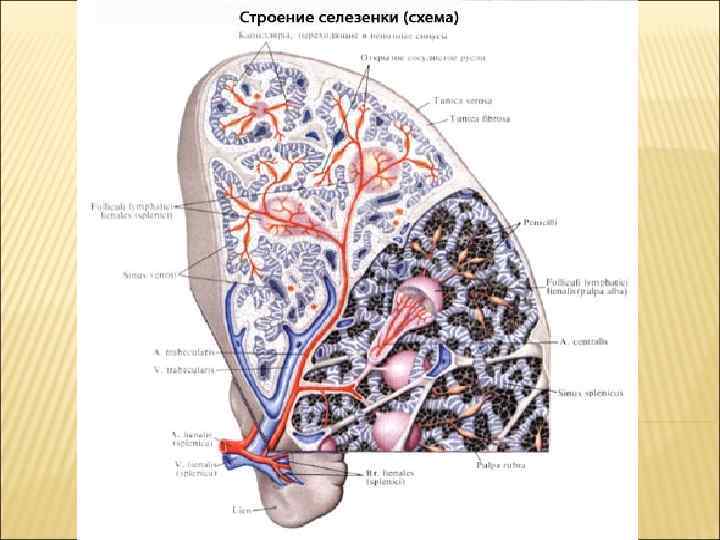 Серозная и волокнистая оболочки Трабекулы Трабекулярная артерия и вена Красная пульпа Белая пульпа: -реактивный центр узелка -центральная артерия узелка