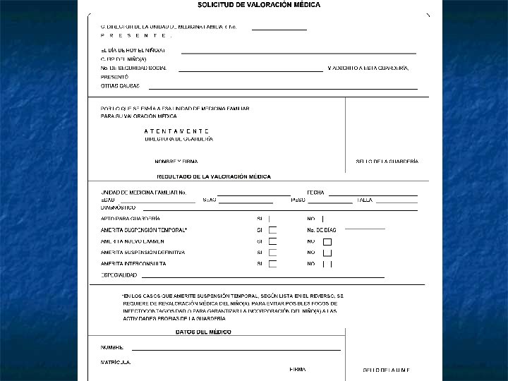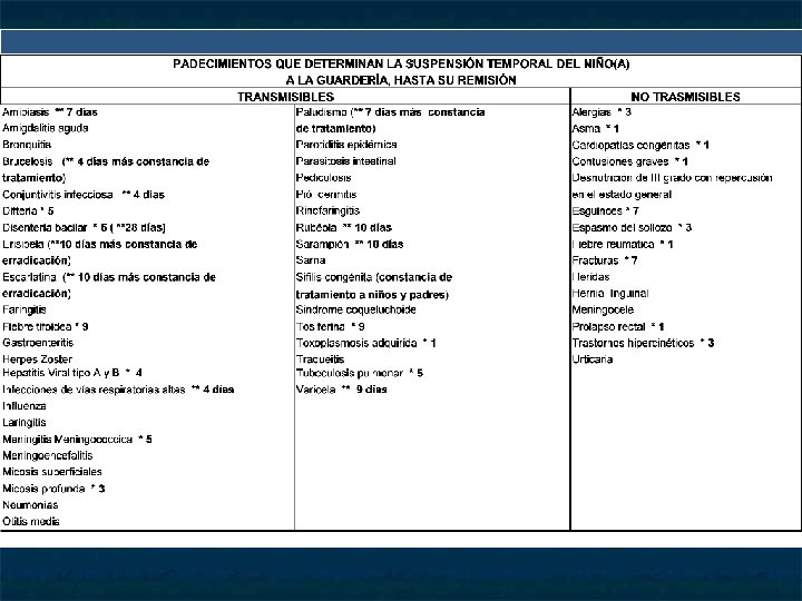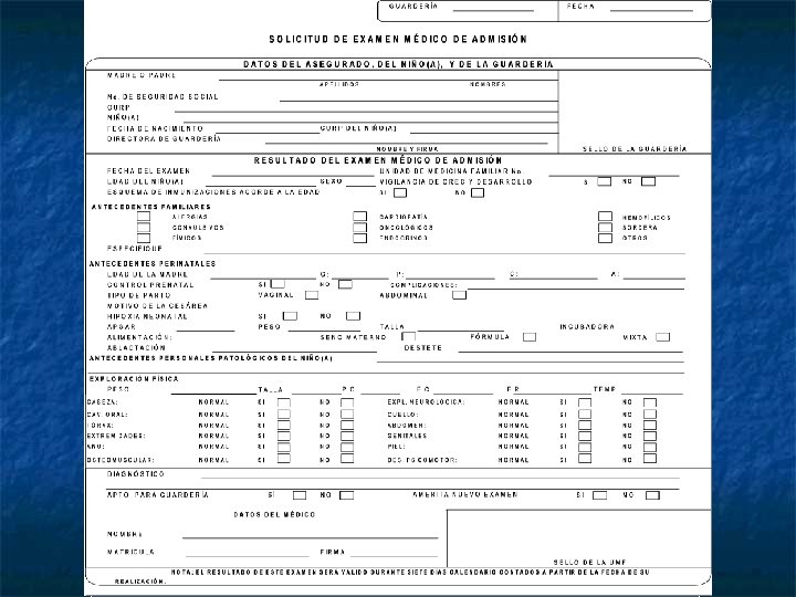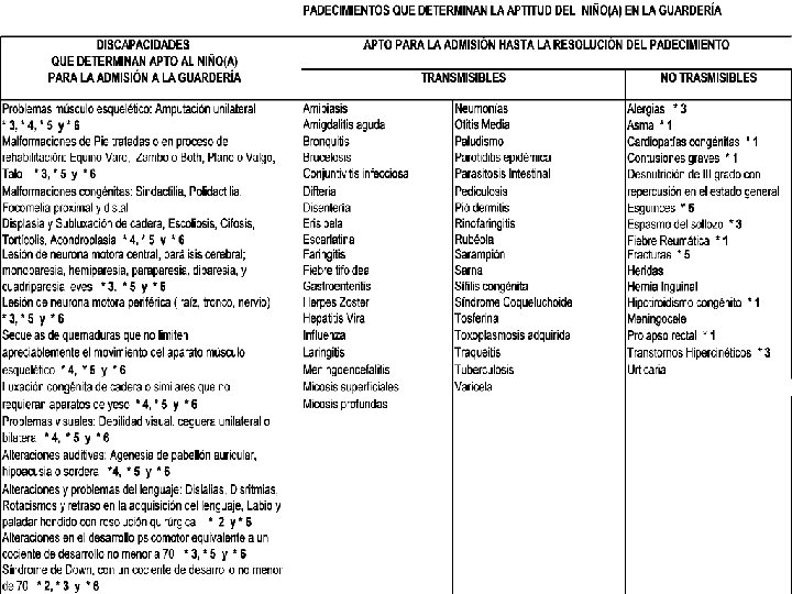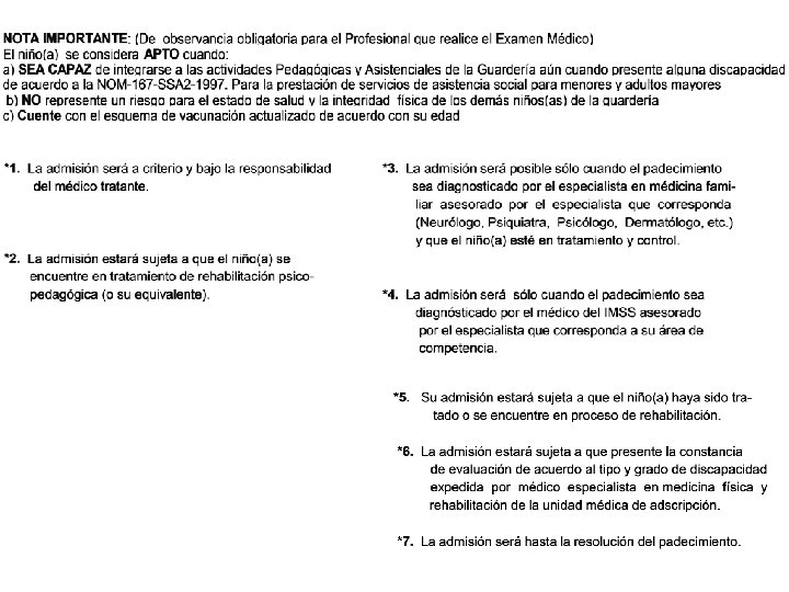 GUARDERIAS INFANTILES RIESGO PARA LA SALUD MANUAL DE OPERACIÓN GUARDERIAS IMSS a) b) c) d) e) f) Criterios de ingreso Exámenes de ingreso Valoración de APTITUD Suspensiones temporales y definitivas recetas. Capacitación personal guardería y exámenes de laboratorio