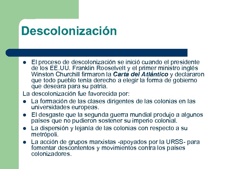 Descolonización El proceso de descolonización se inició cuando el presidente de los EE. UU. Franklin Rooselvelt y el primer ministro inglés Winston Churchill firmaron la Carta del Atlántico y declararon que todo pueblo tenía derecho a elegir la forma de gobierno que deseara para su patria. La descolonización fue favorecida por: l La formación de las clases dirigentes de las colonias en las universidades europeas. l El desgaste que la segunda guerra mundial produjo a algunos países que no pudieron sostener su imperio colonial. l La dispersión y lejanía de las colonias con respecto a su metrópoli. l La acción de grupos marxistas -apoyados por la URSS- para fomentar descontentos y movimientos contra los países colonizadores. l