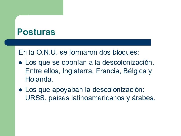 Posturas En la O. N. U. se formaron dos bloques: l Los que se oponían a la descolonización. Entre ellos, Inglaterra, Francia, Bélgica y Holanda. l Los que apoyaban la descolonización: URSS, países latinoamericanos y árabes.