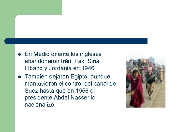 l l En Medio oriente los ingleses abandonaron Irán, Irak, Siria, Líbano y Jordania en 1946. También dejaron Egipto, aunque mantuvieron el control del canal de Suez hasta que en 1956 el presidente Abdel Nasser lo nacionalizó.