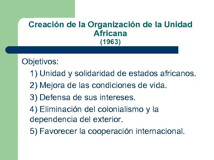 Creación de la Organización de la Unidad Africana (1963) Objetivos: 1) Unidad y solidaridad de estados africanos. 2) Mejora de las condiciones de vida. 3) Defensa de sus intereses. 4) Eliminación del colonialismo y la dependencia del exterior. 5) Favorecer la cooperación internacional.