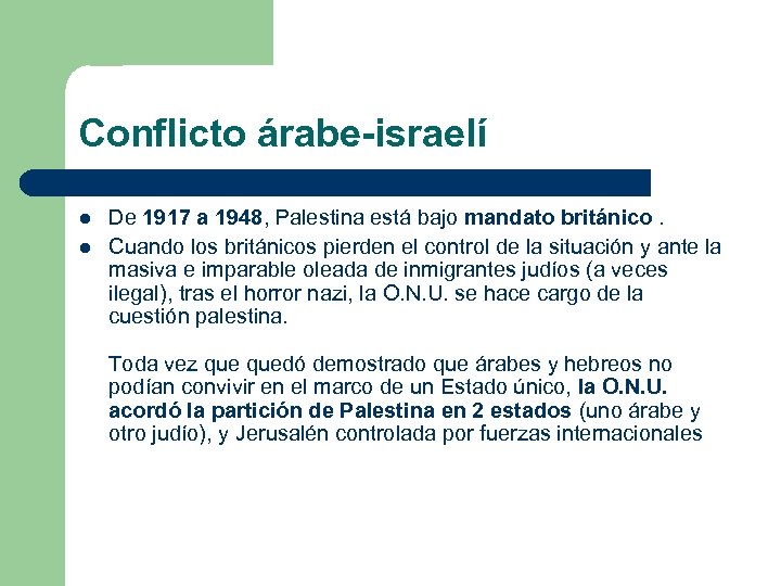 Conflicto árabe-israelí l l De 1917 a 1948, Palestina está bajo mandato británico. Cuando los británicos pierden el control de la situación y ante la masiva e imparable oleada de inmigrantes judíos (a veces ilegal), tras el horror nazi, la O. N. U. se hace cargo de la cuestión palestina. Toda vez quedó demostrado que árabes y hebreos no podían convivir en el marco de un Estado único, la O. N. U. acordó la partición de Palestina en 2 estados (uno árabe y otro judío), y Jerusalén controlada por fuerzas internacionales