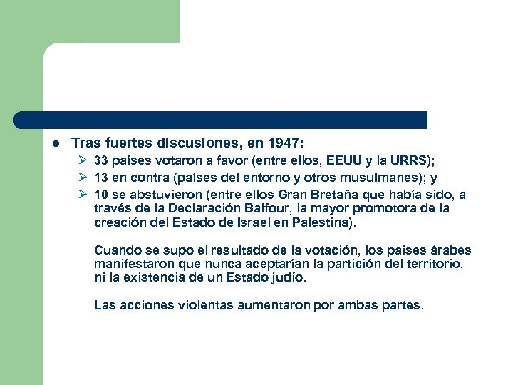 l Tras fuertes discusiones, en 1947: Ø 33 países votaron a favor (entre ellos, EEUU y la URRS); Ø 13 en contra (países del entorno y otros musulmanes); y Ø 10 se abstuvieron (entre ellos Gran Bretaña que había sido, a través de la Declaración Balfour, la mayor promotora de la creación del Estado de Israel en Palestina). Cuando se supo el resultado de la votación, los países árabes manifestaron que nunca aceptarían la partición del territorio, ni la existencia de un Estado judío. Las acciones violentas aumentaron por ambas partes.