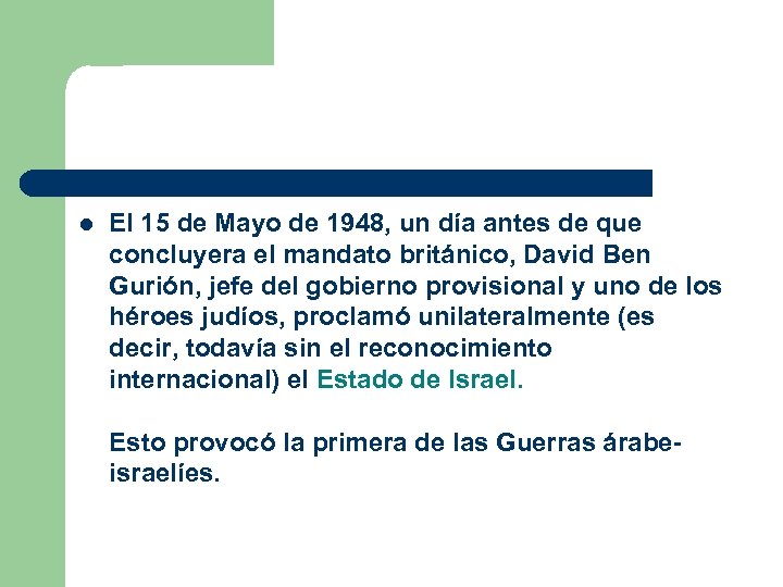 l El 15 de Mayo de 1948, un día antes de que concluyera el mandato británico, David Ben Gurión, jefe del gobierno provisional y uno de los héroes judíos, proclamó unilateralmente (es decir, todavía sin el reconocimiento internacional) el Estado de Israel. Esto provocó la primera de las Guerras árabeisraelíes.