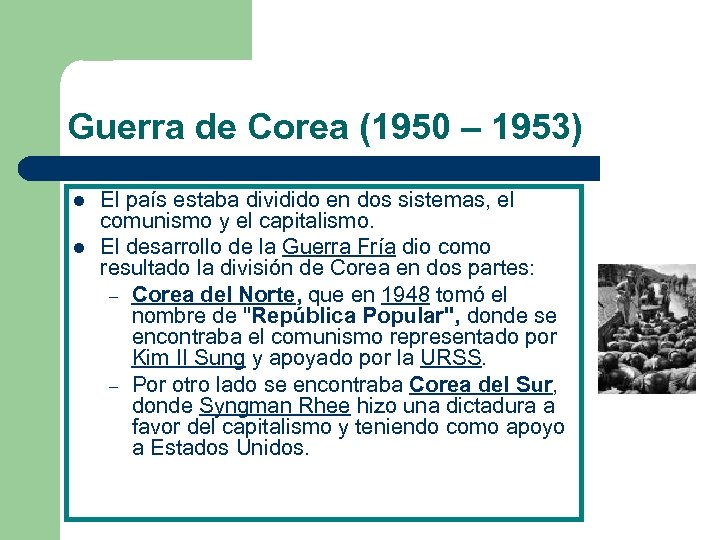 Guerra de Corea (1950 – 1953) l l El país estaba dividido en dos sistemas, el comunismo y el capitalismo. El desarrollo de la Guerra Fría dio como resultado la división de Corea en dos partes: – Corea del Norte, que en 1948 tomó el nombre de "República Popular", donde se encontraba el comunismo representado por Kim II Sung y apoyado por la URSS. – Por otro lado se encontraba Corea del Sur, donde Syngman Rhee hizo una dictadura a favor del capitalismo y teniendo como apoyo a Estados Unidos.