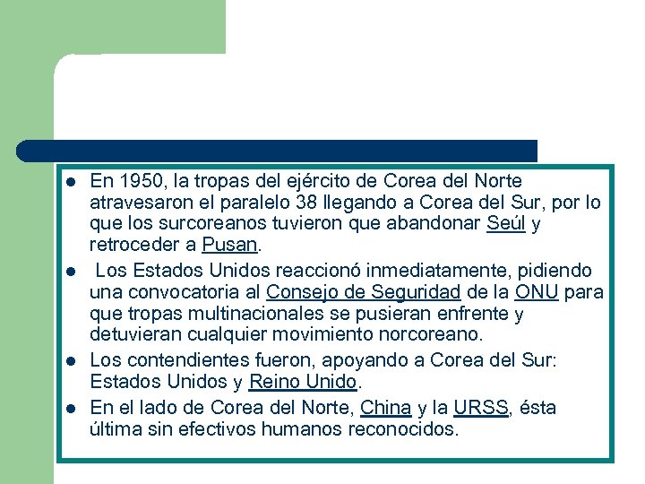 l l En 1950, la tropas del ejército de Corea del Norte atravesaron el paralelo 38 llegando a Corea del Sur, por lo que los surcoreanos tuvieron que abandonar Seúl y retroceder a Pusan. Los Estados Unidos reaccionó inmediatamente, pidiendo una convocatoria al Consejo de Seguridad de la ONU para que tropas multinacionales se pusieran enfrente y detuvieran cualquier movimiento norcoreano. Los contendientes fueron, apoyando a Corea del Sur: Estados Unidos y Reino Unido. En el lado de Corea del Norte, China y la URSS, ésta última sin efectivos humanos reconocidos.