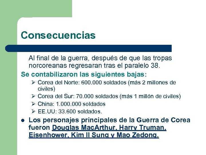 Consecuencias Al final de la guerra, después de que las tropas norcoreanas regresaran tras el paralelo 38. Se contabilizaron las siguientes bajas: Ø Corea del Norte: 600. 000 soldados (más 2 millones de civiles) Ø Corea del Sur: 70. 000 soldados (más 1 millón de civiles) Ø China: 1. 000 soldados Ø EE. UU: 33. 600 soldados. l Los personajes principales de la Guerra de Corea fueron Douglas Mac. Arthur, Harry Truman, Eisenhower, Kim II Sung y Mao Zedong.