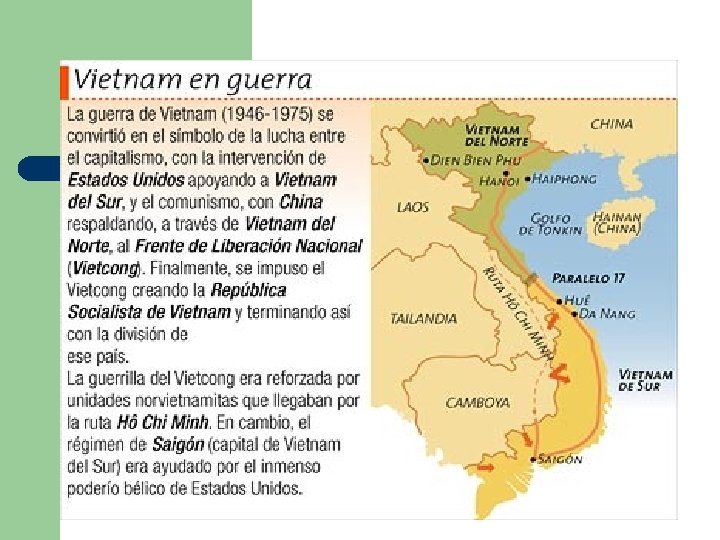 Guerra de Vietnam (1960 – 1975) l l Enfrentamiento militar que tuvo lugar en Vietnam. Su origen fue la determinación de las guerrillas comunistas (el llamado Vietcong) de Vietnam del Sur, apoyadas por Vietnam del Norte, de derrocar al gobierno survietnamita. El enfrentamiento desembocó en una guerra entre ambos países que pronto se convirtió en un conflicto internacional cuando Estados Unidos y otros 40 países más apoyaron a Vietnam del Sur. Por otro lado, la Unión de Repúblicas Socialistas Soviéticas (URSS) y la República Popular China suministraron municiones a Vietnam del Norte y al Vietcong.