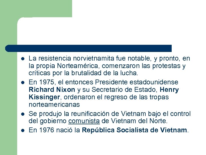 l l La resistencia norvietnamita fue notable, y pronto, en la propia Norteamérica, comenzaron las protestas y críticas por la brutalidad de la lucha. En 1975, el entonces Presidente estadounidense Richard Nixon y su Secretario de Estado, Henry Kissinger, ordenaron el regreso de las tropas norteamericanas Se produjo la reunificación de Vietnam bajo el control del gobierno comunista de Vietnam del Norte. En 1976 nació la República Socialista de Vietnam.