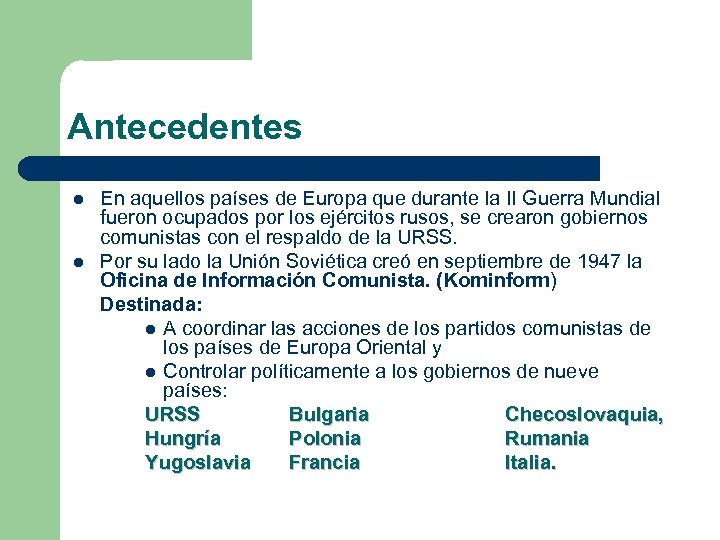 Antecedentes l l En aquellos países de Europa que durante la II Guerra Mundial fueron ocupados por los ejércitos rusos, se crearon gobiernos comunistas con el respaldo de la URSS. Por su lado la Unión Soviética creó en septiembre de 1947 la Oficina de Información Comunista. (Kominform) Destinada: l A coordinar las acciones de los partidos comunistas de los países de Europa Oriental y l Controlar políticamente a los gobiernos de nueve países: URSS Bulgaria Checoslovaquia, Hungría Polonia Rumania Yugoslavia Francia Italia.