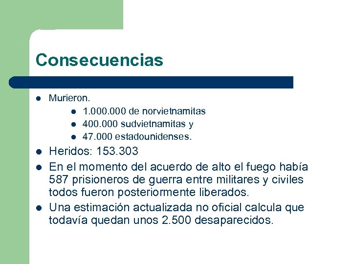 Consecuencias l Murieron. l 1. 000 de norvietnamitas l 400. 000 sudvietnamitas y l 47. 000 estadounidenses. l Heridos: 153. 303 En el momento del acuerdo de alto el fuego había 587 prisioneros de guerra entre militares y civiles todos fueron posteriormente liberados. Una estimación actualizada no oficial calcula que todavía quedan unos 2. 500 desaparecidos. l l