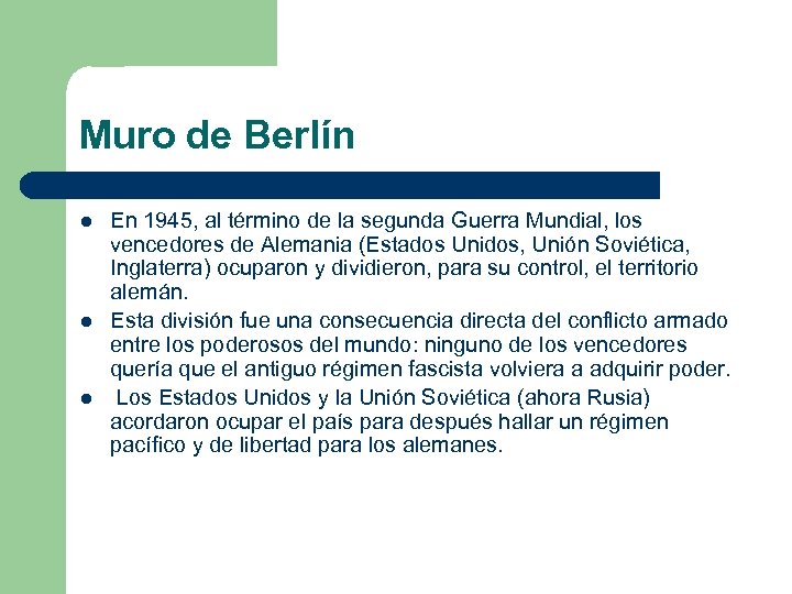 Muro de Berlín l l l En 1945, al término de la segunda Guerra Mundial, los vencedores de Alemania (Estados Unidos, Unión Soviética, Inglaterra) ocuparon y dividieron, para su control, el territorio alemán. Esta división fue una consecuencia directa del conflicto armado entre los poderosos del mundo: ninguno de los vencedores quería que el antiguo régimen fascista volviera a adquirir poder. Los Estados Unidos y la Unión Soviética (ahora Rusia) acordaron ocupar el país para después hallar un régimen pacífico y de libertad para los alemanes.