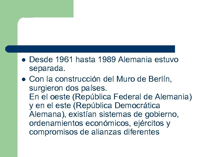 l l Desde 1961 hasta 1989 Alemania estuvo separada. Con la construcción del Muro de Berlín, surgieron dos países. En el oeste (República Federal de Alemania) y en el este (República Democrática Alemana), existían sistemas de gobierno, ordenamientos económicos, ejércitos y compromisos de alianzas diferentes