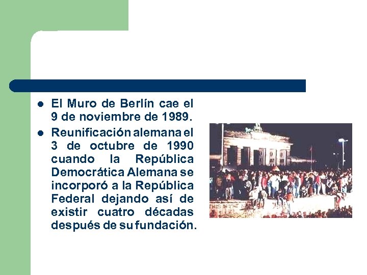 l l El Muro de Berlín cae el 9 de noviembre de 1989. Reunificación alemana el 3 de octubre de 1990 cuando la República Democrática Alemana se incorporó a la República Federal dejando así de existir cuatro décadas después de su fundación.