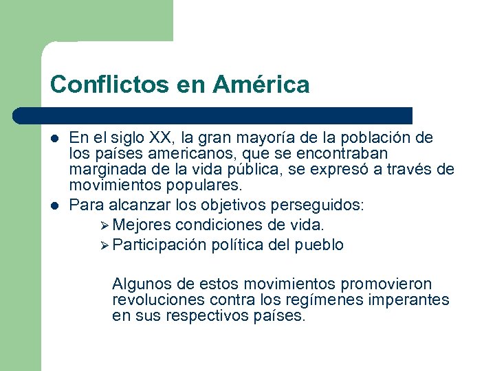 Conflictos en América l l En el siglo XX, la gran mayoría de la población de los países americanos, que se encontraban marginada de la vida pública, se expresó a través de movimientos populares. Para alcanzar los objetivos perseguidos: Ø Mejores condiciones de vida. Ø Participación política del pueblo Algunos de estos movimientos promovieron revoluciones contra los regímenes imperantes en sus respectivos países.