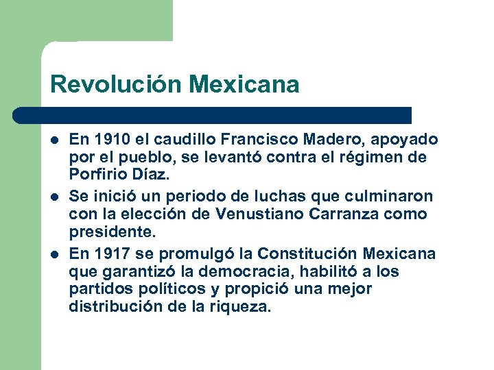 Revolución Mexicana l l l En 1910 el caudillo Francisco Madero, apoyado por el pueblo, se levantó contra el régimen de Porfirio Díaz. Se inició un periodo de luchas que culminaron con la elección de Venustiano Carranza como presidente. En 1917 se promulgó la Constitución Mexicana que garantizó la democracia, habilitó a los partidos políticos y propició una mejor distribución de la riqueza.