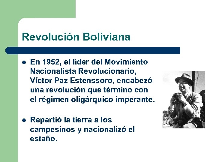 Revolución Boliviana l En 1952, el líder del Movimiento Nacionalista Revolucionario, Víctor Paz Estenssoro, encabezó una revolución que término con el régimen oligárquico imperante. l Repartió la tierra a los campesinos y nacionalizó el estaño.